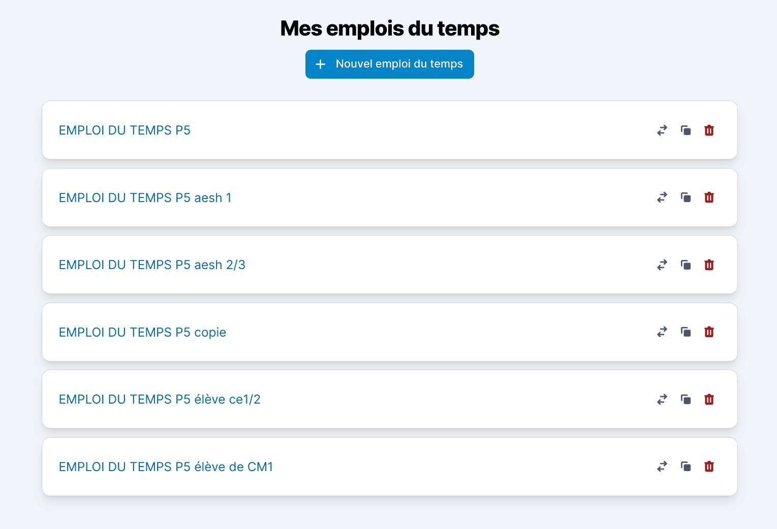 Ensuite je duplique l’emploi du temps autant de fois que nécessaire : j’en réalise un pour chaque AESH et un pour chaque élève soit un total de 12 emplois du temps à chaque période ! C’est pourquoi utiliser Teetsh est devenu indispensable.